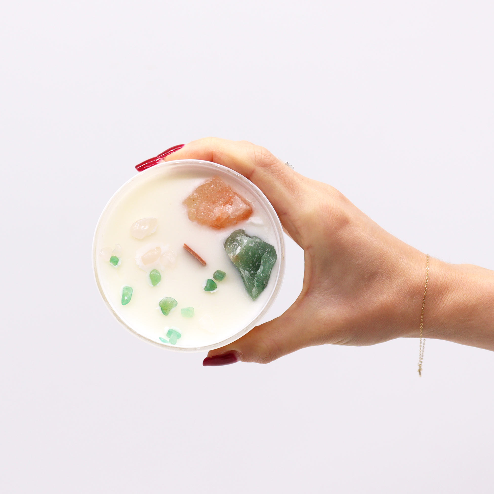 A gyertya meggyújtásakor érezni fogod a kristályok gyógyító energiáját és a különlegesen kevert aroma nyugtató illatát. A gyertya elégetése után a tartály újrafelhasználható, így megtisztíthatod és felhasználhatod a kristályokat.