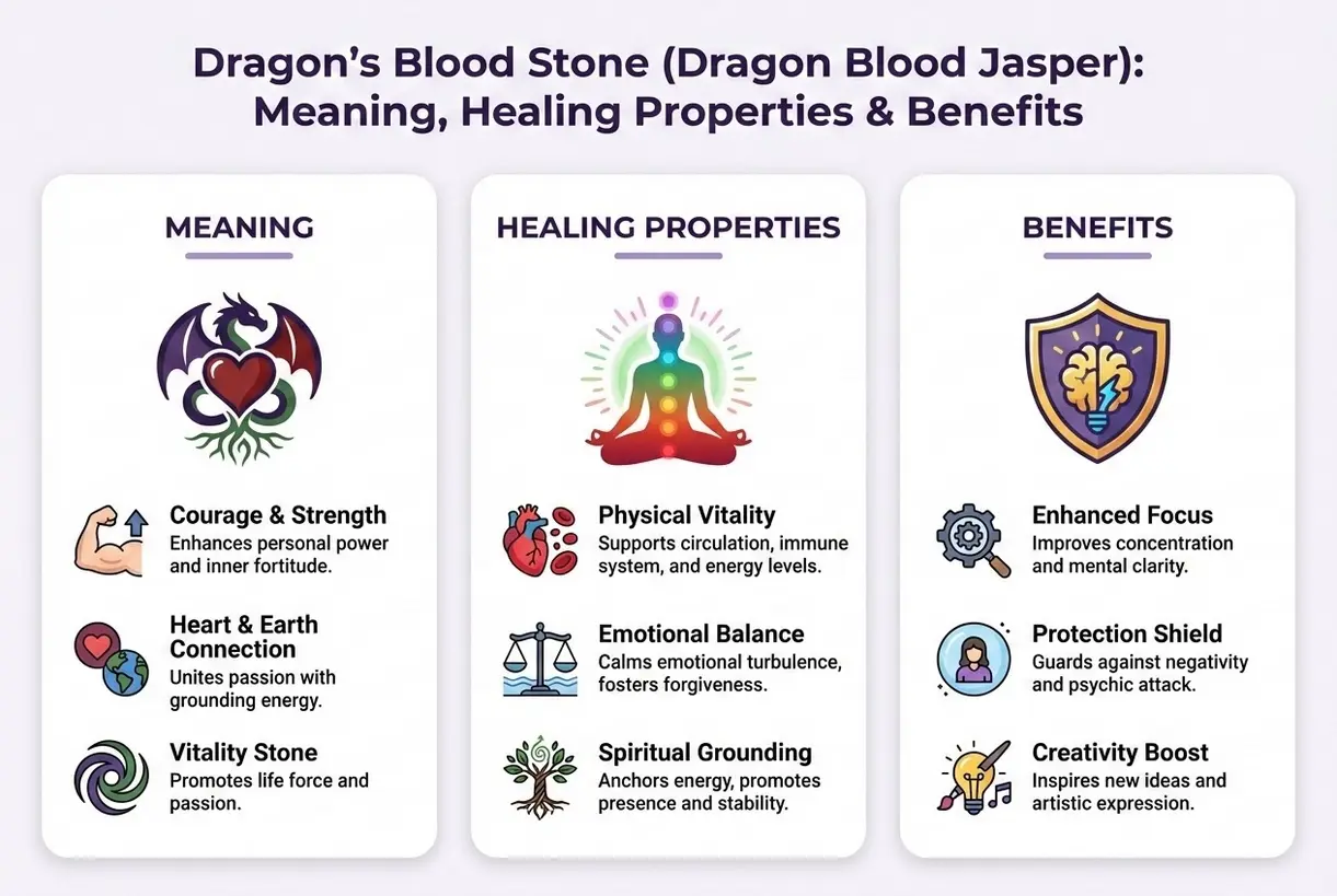 Ez a kristály arra ösztönzi viselőjét, hogy bátor szívvel nézzen szembe a nehézségekkel. Nem az agresszió köve, hanem inkább az öntudatos erő köve. Segít kiállni magadért. Azok számára, akik félénknek vagy kényelmetlenül érzik magukat társasági helyzetekben, a Sárkányvér Jáspis energiája védőpajzsot nyújthat, amely növeli az önbizalmat és az önbecsülést.